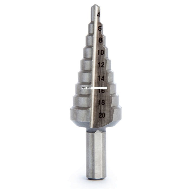 The Abracs SD420 Metal Cutting Step Drill with 9 incremental steps: 4-6-8-10-12-14-16-18 and 20mm