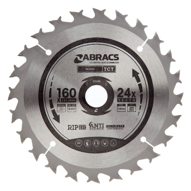 Abracs TCTC16024 TCT Cordless Circular Saw Blade for Wood 160 x 20mm x 24T The Abracs TCTC16024 Cordless Circular Saw Blade has been manufactured with Tungsten carbide-tipped teeth giving the blade for extreme wear resistance and a long working life. The blade is thinner which saves on the battery life of a cordless tool. The TCTC16024 is 160mm in diameter, with 24 teeth, and 1.0mm thick giving a kerf of 1.6mm. Featuring a fully hardened plate offering precision accuracy. The blade also has expansion slots to eliminate the risk of warping. These TCT blades from Abracs are available in a variety of sizes with different teeth configurations and cut types to suit all types of wood. Depending on what finish you prefer, fewer teeth give a faster cut and more teeth give a finer finish. 1 x bushing washer is included with this blade to alter the bore from 20mm to 16mm. Features: Lightweight for increased battery life Extra thin Kerf Anti-Kick back Extreme life Specification: Cut Type: Coarse/Rip Machine: Cordless Kerf: 1.6mm Plate: 1.0mm Rake: Positive Max. RPM: 9000
