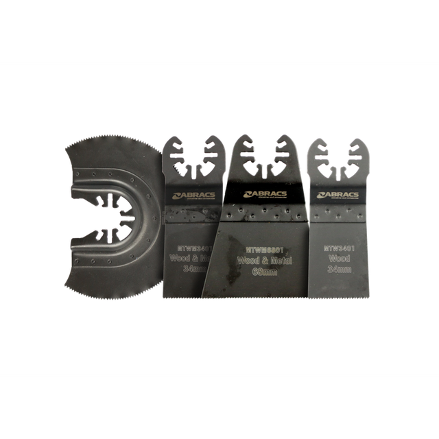 Abracs Multi Tool Wood & Metal Blade Set 4 Piece 34mm Wood, 87mm Wood, 34mm Wood & Metal, 68mm Wood & Metal Abracs range of Multi-Tool Blades are designed for high performance and maximum versatility in professional use Multi Material Precision Cut Maximum Performance