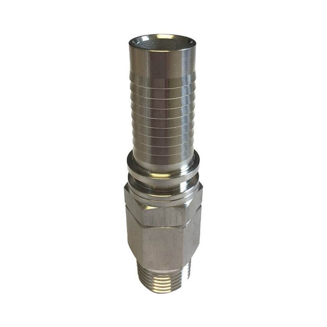 Swivel hose tail connection for water guns. Tail is serrated for secure connection. Constructed from 316 stainless steel with EPDM seal.