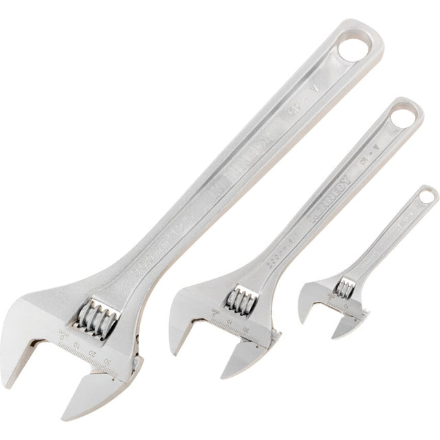 Manufactured from high strength 'I' beam section chrome vanadium steel for improved strength and rigidity, these wrecnch sets are ideal for industrial professional use. On each pair, the jaws are heat treated for extended tool life and have a high polished corrosion-resistant finish. The 15 offset head angle allows for positive torque control whilst the slimline tapered jaws offer improved access into confined spaces. The parallel jaws have a smooth jaw adjustment and self-locking design that prevents the jaws from opening unintentionally even when under full load. Suitable for industrial engineering, automotive, agricultural, maintenance and assembly applications and available as a set of 2 with 6in. and 10in. wrenches or a set of 3 with a 4in., 8in. and 12in. wrench.