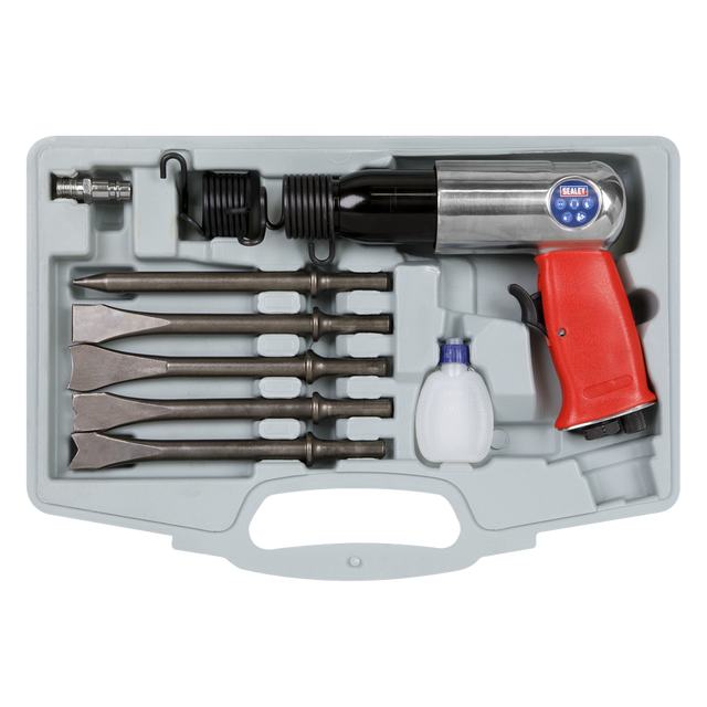 Generation Series air hammer kit. Handle exhaust reduces noise emission, and contoured, soft grip allows added comfort and control. Chisel variety covers a range of different job applications. Supplied in storage case.