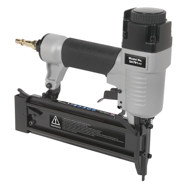 Professional air nail gun with lightweight aluminium body and rubber grip handle. Fastener size 18 gauge nails 3/8-2 (10-50mm). Magazine capacity 100 nails with built-in capacity indicator. Firing mode contact actuation. Thumbscrew adjustment of drive depth to suit application. Adjustable 360 exhaust allowing air to be directed away from debris. Supplied with storage case with oiler and starter pack of nails.