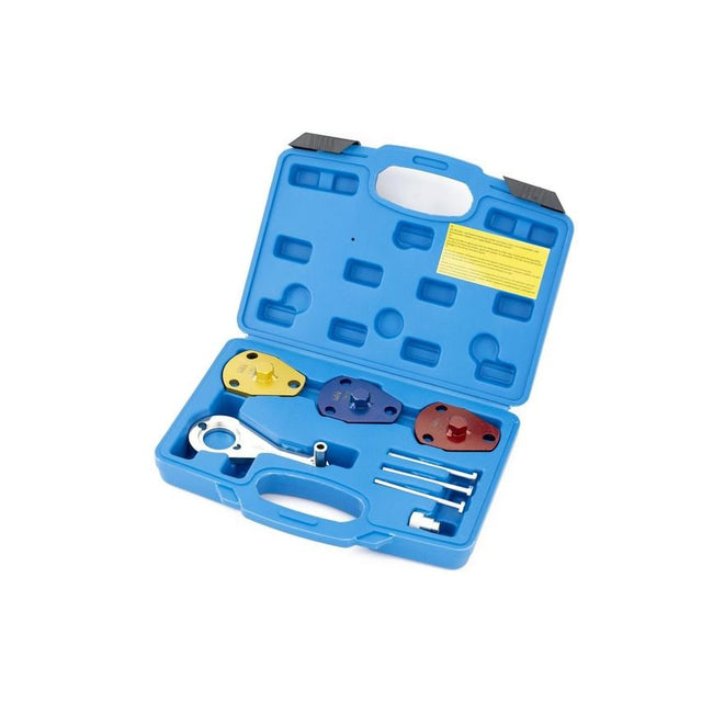Timing tool set for locking crankshaft, camshaft and injection pump during adjustment, repair or belt replacement on Alfa Romeo and Fiat 1.7 and 1.9L diesel engines. Plate applications as follow blue 1.7L D/DT, yellow 1.9L D and red 1.9L DT. Supplied in carry case.