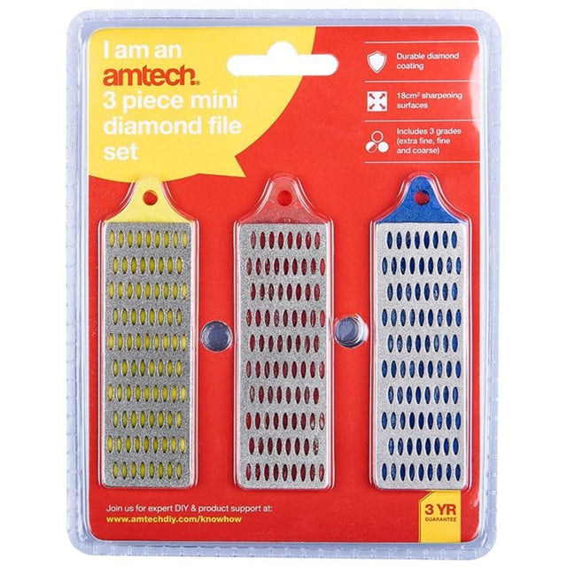 DURABLE: This diamond file sharpening set has an 18cm2 surface area with 3 assorted grades: coarse, fine and extra fine, and is extremely durable. EASY TO USE: They are ideal for quick, easy and effortless sharpening of a wide range of tools including plane irons, chisels, blades, router cutters and garden tools. NO LUBRICATION: No oil lubrication needed - they only require water. Contents: extra fine, fine and coarse grades.