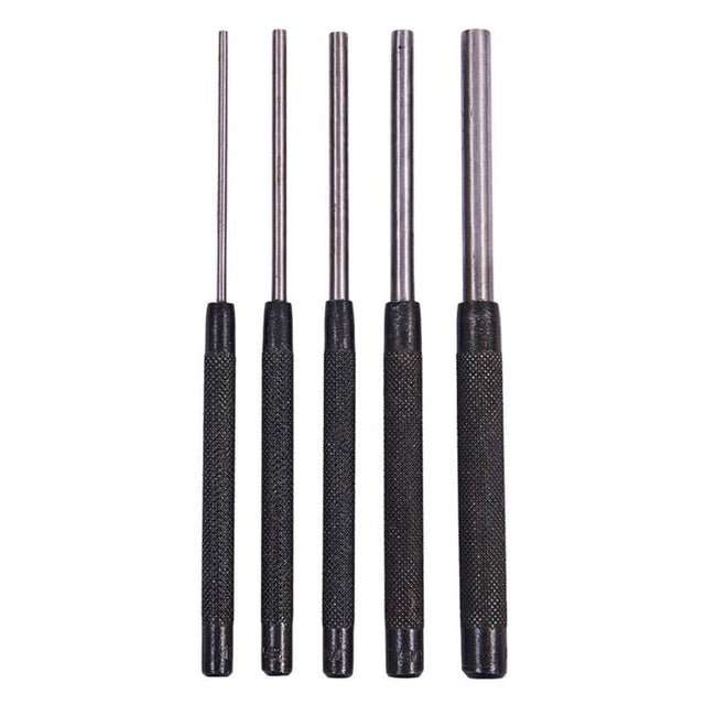 DURABLE: This parallel pin punch set is made from strong, heat treated carbon steel for durability. EASY TO USE: They have non-slip grips with knurled handles for ease of use. SIZES: 200mm (8") in length, the set includes sizes 1/8", 3/16", 1/4", 5/16" and 3/8".