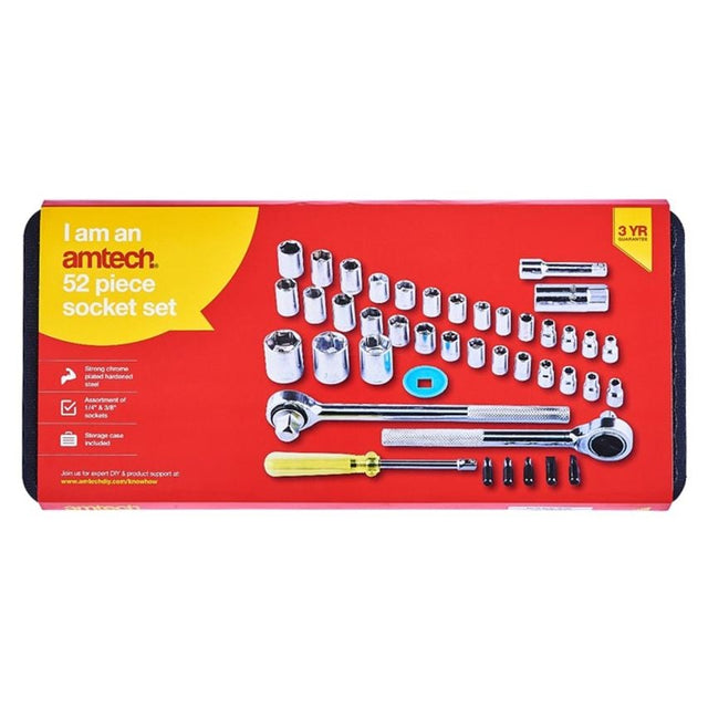 DURABLE: This 52 piece socket set is made from strong, triple chrome plated and hardened steel for durability. CONTENTS: It includes a useful assortment of 1/4", 3/8" and 1/2" drive sockets. CARRY CASE: It is supplied in a sturdy, blow moulded storage case. Contents:- 1/4" drive sockets: 12 x 6pt AF sockets: 5/32", 3/16", 7/32", 1/4", 9/32", 5/16", 11/32", 3/8", 7/16", 15/32", and 1/2"- 3 x 8pt AF sockets: 1/4", 5/16", and 3/8"13 x 6pt metric sockets: 4, 4.5, 5, 5.5, 6, 6.5, 7, 8, 9, 10, 11, 12, and 13 mm- 3/8" drive sockets:3 x 6pt AF sockets: 7/16", 1/2", 9/16"3 x 6pt metric sockets: 11, 12, and 13mm- 1/2" drive sockets:4 x 6pt metric sockets: 16, 17, 18, and 21mm- 1 x 1/4" hex bit socket- 2 x slotted drive bits: 3/16", 9/32"- 3 x Phillips driver bits: #1, #2, #3- 1 x Spin disc- 1 x 3/8" to 1/4" drive adaptor- 1 x 5/8" spark plug socket- 1 x spinner handle- 1 x 1/2" drive reversible ratchet handle- 1 x 3/8" drive reversible ratchet handle- 1 x 3" extension bar.