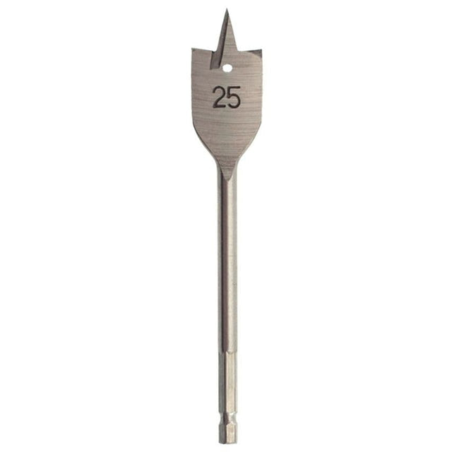 CAN BE RESHARPENED: This 25mm x 152mm flat wood drill bit is made from durable carbon steel which can be re-sharpened. QUICK CHANGE: With a 6mm (1/4") quick change hexagonal shank, it is ideal for drilling composite, laminated and solid wood.