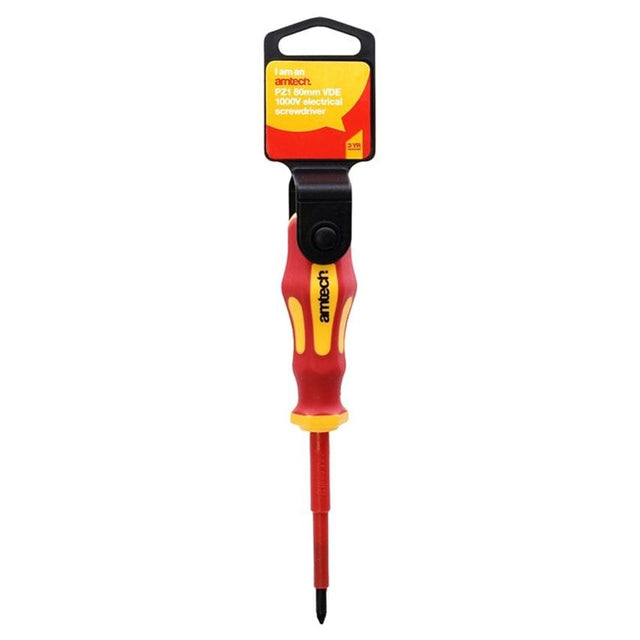 CERTIFIED: This 80mm Pozidriv PZ 1 electrical screwdriver is tested to 1000V and is VDE certified to EN IEC 60900:2018. INSULATED: An insulated sheath runs the length of the screwdriver's bar to protect the user from live current. DURABLE: This VDE screwdriver has a tough, chrome vanadium shaft with a corrosion-resistant tip for durability. ERGONOMIC: Ergonomically designed, it has an easily identifiable dual-colour handle. VERSATILE: It is ideal for use on household electrical circuits.