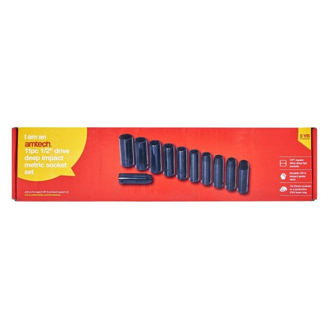 DURABLE: These 13mm (1/2'') square drive deep impact sockets are made from tough, chrome vanadium steel with a black finish. VERSATILE: They have a socket length of 80mm and the set includes sizes ranging from 10mm to 24mm. They are supplied in a protective EVA foam tray.