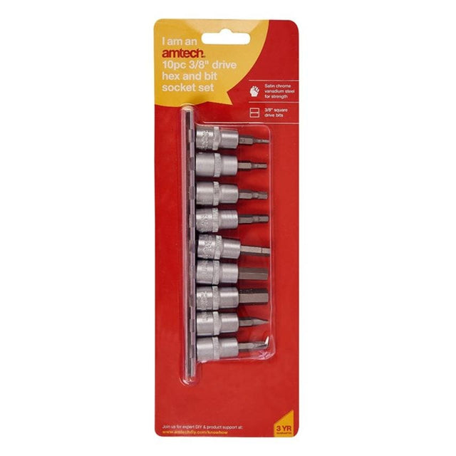 DURABLE: This socket and hex set has drop forged steel sockets with chrome vanadium steel bits for extra durability. SIZES: Provided with a handy storage rail, the set includes hex sizes 3mm, 4mm, 5mm, 5.5mm, 6mm, 8mm, 10mm, slotted 6mm and Phillips #2.