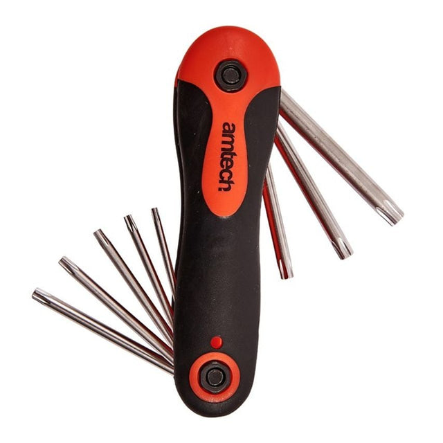 DURABLE: This handy folding Torx key set is made from chrome vanadium steel with a satin finish for durability. EASY USE AND STORAGE: With a soft-grip, ergonomic handle for comfort and ease of use, the keys fold away for easy storage. 8 SIZES: T9, T10, T15, T20, T25, T27, T30 & T40. VERSATILE: It is ideal for a wide range of household, DIY and auto repair uses.