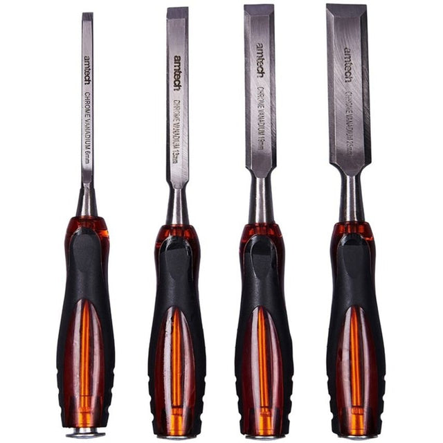 DURABLE: This 4 piece go thru wood chisel set has hardened and tempered chrome vanadium steel blades and metal striking caps. EASY TO USE: With soft grip handles and blade guards, the have a useful bevel edge pattern. VERSATILE: The set includes sizes 6mm, 13mm, 19mm and 25mm and is ideal for many DIY woodworking applications. PLEASE NOTE: These products need to be sharpened before use.