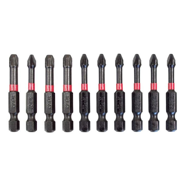 DURABLE: This 10 piece impact grade 50mm screwdriver bit set has a black oxide coating for durability. QUICK CHANGE: It has a quick change 1/4" hex. shank for convenience. CORDED OR CORDLESS: The bit set can be used in both corded or cordless impact drivers for added versatility. Contents:50mm hex shank impact driver bits, 5 x PZ2, 3 x PZ3, 2 x PH2.