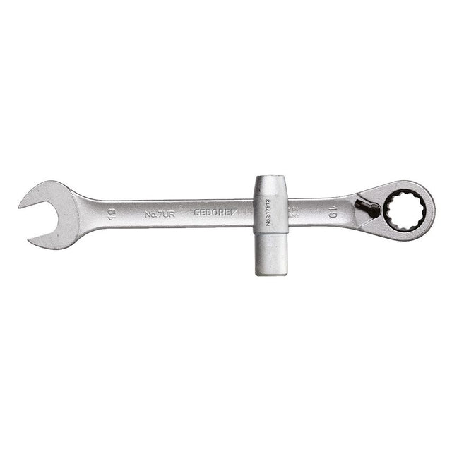 With moveable stud screw insert for bathroom fittings attachment M10 or M12 With reversible ring ratchet size 17 mm for tightening or loosening of bathroom fittings connections even in hard-to-reach areas Open end spanner size 19 mm for tightening or loosening of corner valves GEDORE vanadium steel 31CrV3, matt chrome-plated Vanadium steel 31CrV3, matt chrome-plated