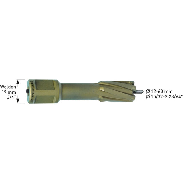 Available in a range of diameters, the Karnasch Hard-Line annular cutters are able to drill hardened steel up to 40 Rockwell (HRC) and strength of 1400N Features and Benefits Available in diameters of 12-150 mm Made with a conical helix for clean chip flow and highest cutting ability even with difficult material Exclusively equipped with Sandvik carbide teeth Made in an elaborate pre-/intermediate-/after-cutting geometry resulting in clatter free, silent and easy cutting with highest lifetimes Typical Applications Drilling in hardened steel up to 40 Rockwell [HRC] and strength of 1400 N Drilling in all sorts of stainless steel Drilling in most difficult alloys [Hardox/Inconel/Titan] Drilling also excellent in all non-ferrous material such as alu, copper, brass and similar
