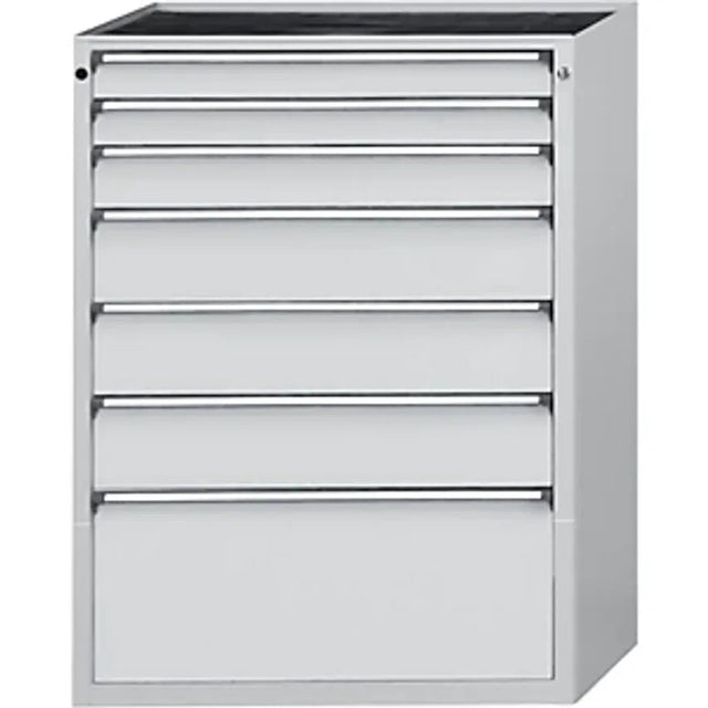 Drawer cupboard, WxD 910 x 675 mm, 7 drawers, height 1280 mm, front in light grey. Supplied = assembled. Height = 1280 mm. Width = 910 mm. Depth = 675 mm. Max. drawer load = 100 kg. Number of drawers = 7 pcs. Drawer height = 2x90, 1x120, 3x180, 1x360 mm. Drawer extension = 100%. Body colour = light grey RAL 7035. Front colour = light grey RAL 7035. Fittings = individual pull-out stop. Material = sheet steel, powder coated. Drawer guide = roller guide. Lock type = central locking with cylinder lock. Internal drawer dimensions = 750x600 mm. Feature = can be labelled. 100 kg max. drawer load. 100% extendable - maximum space utilisation. Individual pull-out stops to protect against tipping. Central locking - cylinder lock with replaceable core or electronic locking. Sturdy, powder coated sheet steel construction. Body light grey RAL 7035. Drawers in two standard colours. Smooth running drawers mounted on roller guides with exact running, 100% extendable. Central locking using cylinder lock, 2 keys incl. Housing lid with all round edge and rubber mat. Also available with battery powered combination lock on request. Your advantage Durable quality products for rough industrial environments.