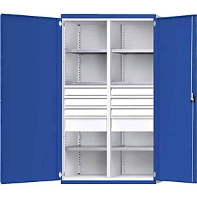 Heavy duty cupboard with centre partition, 8 drawers: 6 x 120, 2 x 180 mm, HxWxD 1950 x 1084 x 690 mm. Supplied = assembled. Height = 1950 mm. Width = 1084 mm. Depth = 690 mm. Internal fittings = 6 shelves, 8 drawers, centre partition. Max. cupboard load = 1200 kg. Housing material = sheet steel. Finish = powder coated. Shelf material = sheet steel, galvanised. Body colour = light grey RAL 7035. Door colour = gentian blue RAL 5010. Max. shelf load = 160 kg. Shelf colour = aluminium silver. Number of shelves = 6 pcs. Shelf width = 490 mm. Shelf depth = 570 mm. Shelf height adjustment increments = 30 mm. Door type = hinged door. Heavy duty cupboard in premium quality - tried and tested in industry and trades. Very robust and durable. Suitable for storing very heavy and large format parts safely and conveniently. Heavy duty cupboard with centre partition fitted with: 6 shelves and 8 drawers: 6 x 120 mm, 2 x 180 mm in height. Max. load per shelf 160 kg, dimensions WxD 490 x 570 mm. Drawers with 100% extension, max. load: 200 kg. Internal dimensions WxD 450 x 600 mm. Colour combination: housing and drawer light grey RAL 7035, doors gentian blue RAL 5010.
