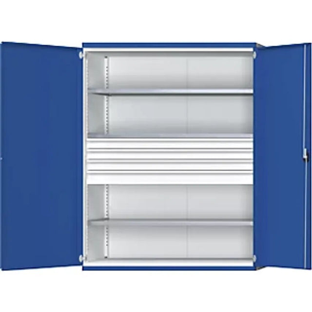 JUMBO heavy duty cupboard with 3 shelves, 4 drawers: 3 x 90, 1 x 120 mm, HxWxD 1950 x 1484 x 690 mm. Supplied = assembled. Height = 1950 mm. Width = 1484 mm. Depth = 690 mm. Internal fittings = 3 shelves, 4 drawers. Max. cupboard load = 1200 kg. Housing material = sheet steel. Finish = powder coated. Shelf material = sheet steel, galvanised. Body colour = light grey RAL 7035. Door colour = gentian blue RAL 5010. Max. shelf load = 160 kg. Shelf colour = aluminium silver. Number of shelves = 3 pcs. Shelf width = 1430 mm. Shelf depth = 570 mm. Shelf height adjustment increments = 30 mm. Door type = hinged door. Heavy duty cupboard in premium quality - tried and tested in industry and trades. Very robust and durable. Suitable for storing very heavy and large format parts safely and conveniently. Heavy duty cupboard without centre partition, with 4 compartments and 4 drawers: 3 x 90, 1 x 120 mm in height. Drawers with roller guides and full extension, 1380 x 600 mm, max. load 200 kg.