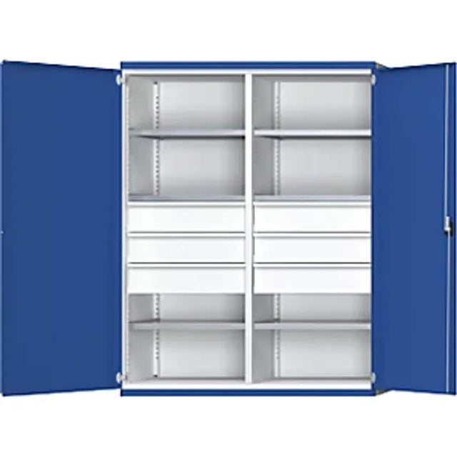 JUMBO heavy duty cupboard with centre partition, 6 drawers 180 mm, HxWxD 1950 x 1484 x 690 mm. Supplied = assembled. Height = 1950 mm. Width = 1484 mm. Depth = 690 mm. Internal fittings = 6 shelves, 6 drawers, centre partition. Max. cupboard load = 1200 kg. Housing material = sheet steel. Finish = powder coated. Shelf material = sheet steel, galvanised. Body colour = light grey RAL 7035. Door colour = gentian blue RAL 5010. Max. shelf load = 160 kg. Shelf colour = aluminium silver. Number of shelves = 6 pcs. Shelf width = 690 mm. Shelf depth = 570 mm. Shelf height adjustment increments = 30 mm. Door type = hinged door. Heavy duty cupboard in premium quality - tried and tested in industry and trades. Very robust and durable. Suitable for storing very heavy and large format parts safely and conveniently. Heavy duty cupboard with centre partition, with 8 compartments and 6 drawers 180 mm in height. Drawers with roller guides and full extension, 650 x 600 mm, max. load 200 kg.