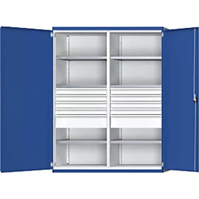 JUMBO heavy duty cupboard with centre partition, 10 drawers, HxWxD 1950 x 1484 x 690 mm. Supplied = assembled. Height = 1950 mm. Width = 1484 mm. Depth = 690 mm. Internal fittings = 6 shelves, 10 drawers, centre partition. Max. cupboard load = 1200 kg. Housing material = sheet steel. Finish = powder coated. Shelf material = sheet steel, galvanised. Body colour = light grey RAL 7035. Door colour = gentian blue RAL 5010. Max. shelf load = 160 kg. Shelf colour = aluminium silver. Number of shelves = 6 pcs. Shelf width = 690 mm. Shelf depth = 570 mm. Shelf height adjustment increments = 30 mm. Door type = hinged door. Heavy duty cupboard in premium quality - tried and tested in industry and trades. Very robust and durable. Suitable for storing very heavy and large format parts safely and conveniently. Heavy duty cupboard with centre partition, with 8 compartments and 10 drawers: 6 x 90, 2 x 120, 2 x 180 mm in height. Drawers with roller guides and full extension, 650 x 600 mm, max. load 200 kg.