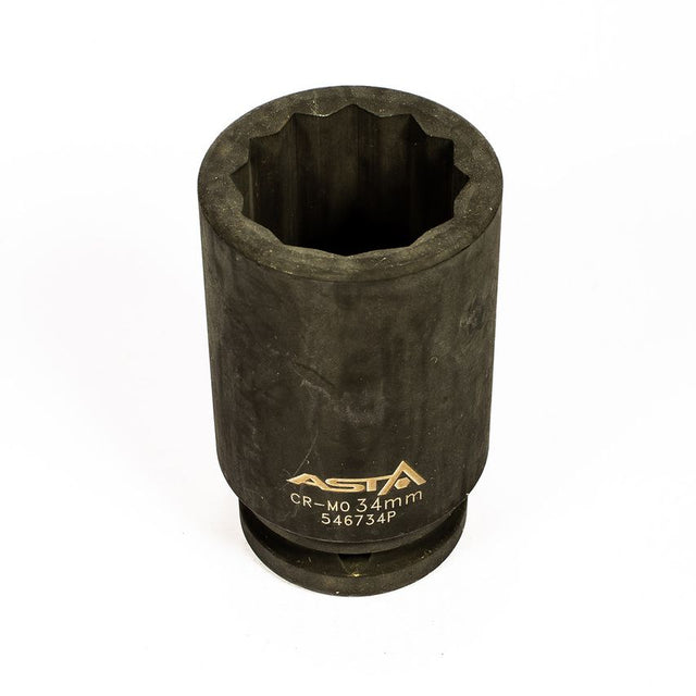 Professional individual 34mm deep impact 12 point socket for use with 3/4" drive impact wrench, ratchet or extension bar. Overall length of 85mm. Made of hardened and tempered Chrome Molybdenum (Cr-Mo) steel with manganese phosphate finish for extra corrosion resistance. Each feature retaining hole for extra safety (pin and safety ring can be purchased separately) Manufactured for professional daily use with air or battery powered impact wrench. Supplied as individual deep impact 12pt socket.