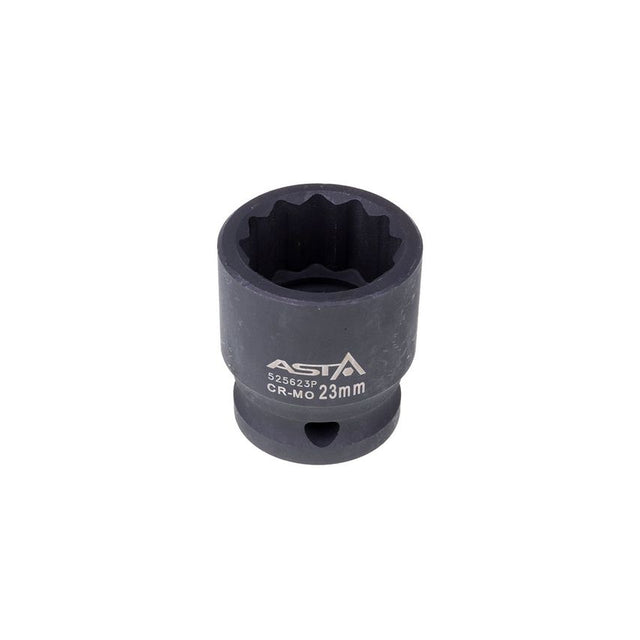 Professional individual 23mm impact 12 point socket for use with 1/2" drive impact wrench, ratchet or extension bar. Overall length of 38mm. Made of hardened and tempered Chrome Molybdenum (Cr-Mo) steel with manganese phosphate finish for extra corrosion resistance. Each feature retaining hole for extra safety (pin and safety ring can be purchased separately) Manufactured for professional daily use with air or battery powered impact wrench. Supplied as individual impact 12pt socket.