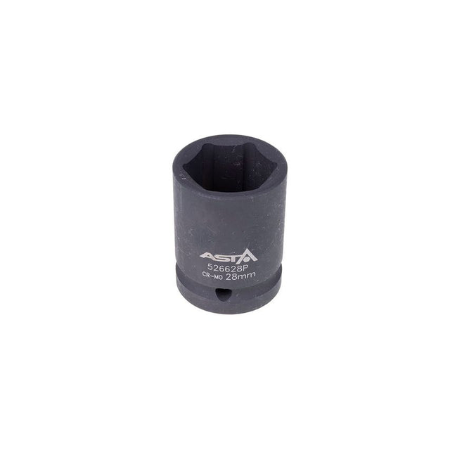 Professional individual 28mm impact socket for use with 3/4" drive impact wrench, ratchet or extension bar. Overall length of 53mm. Made of hardened and tempered Chrome Molybdenum (Cr-Mo) steel with manganese phosphate finish for extra corrosion resistance. Each feature retaining hole for extra safety (pin and safety ring can be purchased separately) Manufactured for professional daily use with air or battery powered impact wrench. Supplied as individual impact socket. Specification: - Size - 28mm - Drive - 3/4" - Length - 53mm - Inner depth - 24mm