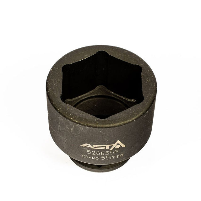 Professional individual 55mm impact socket for use with 3/4" drive impact wrench, ratchet or extension bar. Overall length of 74mm. Made of hardened and tempered Chrome Molybdenum (Cr-Mo) steel with manganese phosphate finish for extra corrosion resistance. Each feature retaining hole for extra safety (pin and safety ring can be purchased separately) Manufactured for professional daily use with air or battery powered impact wrench. Supplied as individual impact socket.