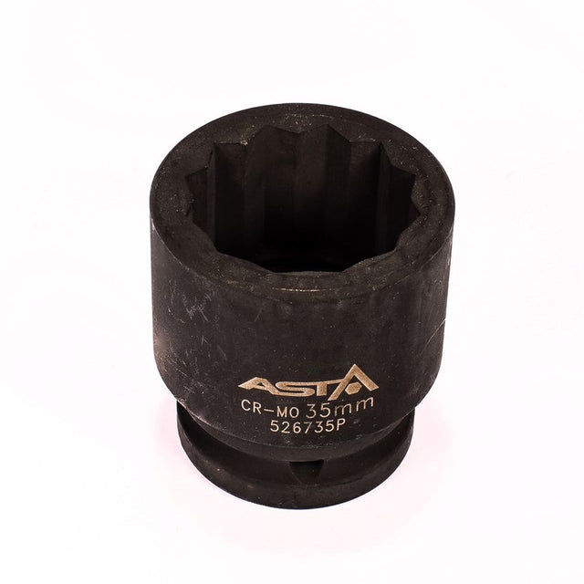 Professional individual 35mm impact 12 point socket for use with 3/4" drive impact wrench, ratchet or extension bar. Overall length of 57mm. Made of hardened and tempered Chrome Molybdenum (Cr-Mo) steel with manganese phosphate finish for extra corrosion resistance. Each feature retaining hole for extra safety (pin and safety ring can be purchased separately) Manufactured for professional daily use with air or battery powered impact wrench. Supplied as individual impact 12pt socket. Specification: - Size - 35mm - Drive - 3/4" - Length - 57mm - Inner depth - 27mm