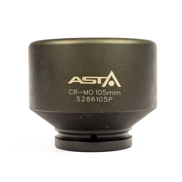 Professional individual 105mm impact socket for use with 1" drive impact wrench, ratchet or extension bar. Overall length of 115mm. Made of hardened and tempered Chrome Molybdenum (Cr-Mo) steel with manganese phosphate finish for extra corrosion resistance. Each feature retaining hole for extra safety (pin and safety ring can be purchased separately) Manufactured for professional daily use with air or battery powered impact wrench. Supplied as individual impact socket.