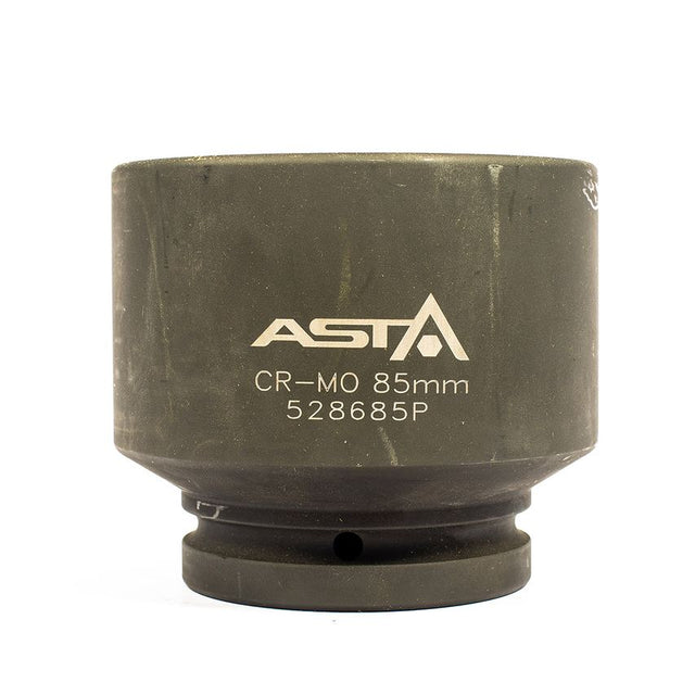 Professional individual 85mm impact socket for use with 1" drive impact wrench, ratchet or extension bar. Overall length of 100mm. Made of hardened and tempered Chrome Molybdenum (Cr-Mo) steel with manganese phosphate finish for extra corrosion resistance. Each feature retaining hole for extra safety (pin and safety ring can be purchased separately) Manufactured for professional daily use with air or battery powered impact wrench. Supplied as individual impact socket.