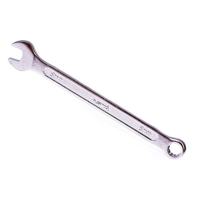 6mm combination spanner with straight open and 15 offset 12 point (12PT) ring end for easier use on flat surfaces. Made of hardened and tempered Chrome Vanadium (Cr-V) steel for maximum performance and durability. Matt finish for resistance to corrosion.