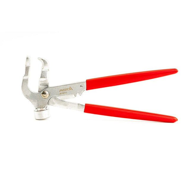 Multipurpose wheel weight pliers for removal and installation of wheel balancing weights. Tool also includes hammer end for kneading weights and flat cutting off blade to trim aluminum weights.