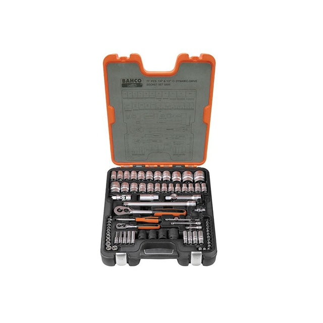 Bahco S800 chrome vanadium 1/4 and 1/2in Drive 77 piece metric and AF socket set, containing: 15 x 1/2in Hex Metric Sockets: 10, 12, 13, 14, 15, 16, 17, 18, 20, 21, 23, 24, 27, 32 & 34mm.9 x 1/2in Hex AF Sockets: 3/8, 7/16, 1/2, 9/16, 11/16, 3/4, 13/16, 7/8 & 1.3/16in. 12 x 1/4in Hex Metric Sockets: 4, 4.5, 5, 5.5, 6, 7, 8, 9, 10, 11, 12 & 13mm.12 x 1/4in Hex Deep Metric Sockets: 4, 5, 6, 7, 8, 9, 10, 11 & 13mm. 4 x 1/2in Hex Impact Sockets: 17, 19, 21 & 24mm.1 x 1/2in Spark Plug Socket: 21mm.3 x 1/4in Slotted Bits: 4, 5.5 & 7mm.4 x 1/4in Phillips Bits: PH1, PH2, PH3 & PH4.6 x 1/4in Hex Bits: 3, 4, 5, 6, 8 & 10mm. 3 x Hex Keys: 1.5, 2 and 2.5mm. 1 x 3/8in F to 1/2in M Adaptor.1 x 1/4in 100mm T Bar, 1 x 1/4in Spinner.1 x 1/2in Universal Joint, 1 x 1/4in Universal Joint.2 x 1/4in Extensions: 50 & 100mm.2 x 1/2in Extensions: 125 & 250mm.1 x 1/4in Reversible Ratchet.1 x 1/2in Reversible Ratchet. 1 x Impact & Oil Resistant Case.