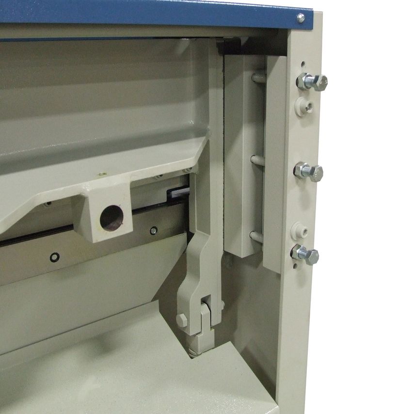 \nThe SF-5216 is easy to operate. Simply put your material between the blade and the table, and stomp the foot pedal. There is also a finger guard for safety when shearing. Other features include a front gauge and back gauge range of 24" for repeatable cuts time and time again.