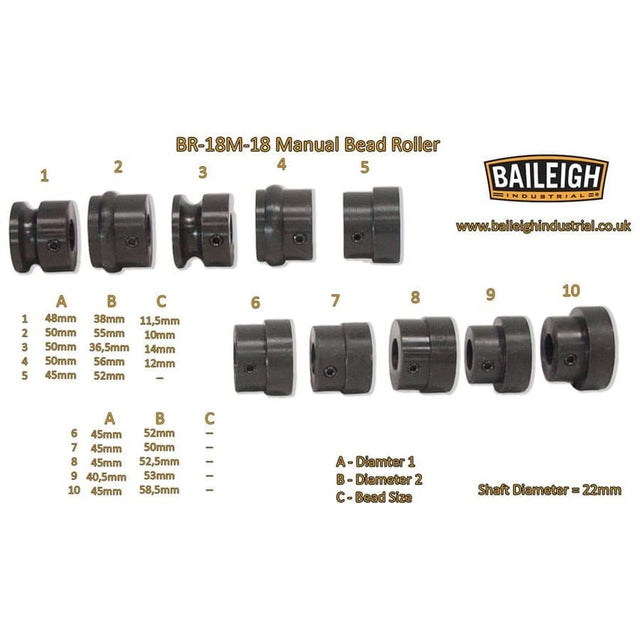 \nMade to take years of abuse in any shop atmosphere, this bead rolling machine comes standard with a heavy duty stand. The BR-18M-18 also comes with a roll rack and six sets of the most common rolls required by metal forming enthusiasts; 1.6mm, 3.2mm, 6.4mm step dies and 6.4mm, 9.5mm, 12.7mm bead dies. For added longevity the drive shafts ride in quality bushings that can be periodically fed grease through grease fittings.