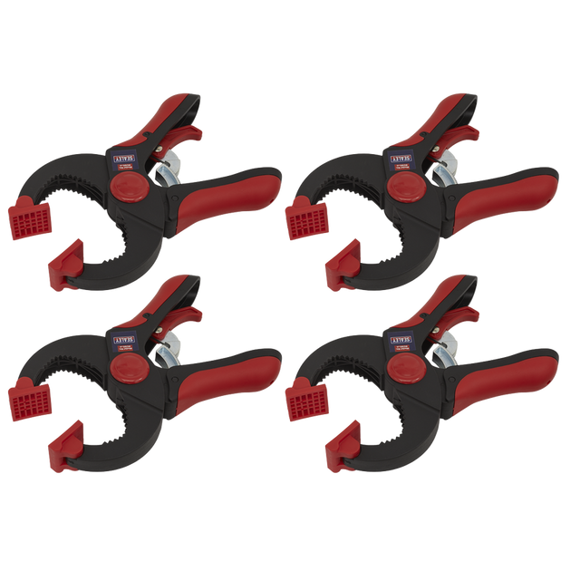 Pack of four quick ratcheting clamps with easy release trigger.