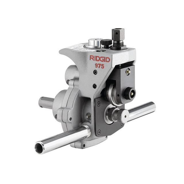 The RIDGID 975 Roll Groover acts as 2 tools in one. It can mount onto the 300 Power Drive for machine powered roll grooving but is also designed to manually roll groove in-place pipe. The 975 Combo Groover includes new, patented auto tracking technology for significantly easier grooving. Whether you're doing machine-powered or manual grooving, the Auto Tracking gauge keeps the pipe automatically engaged to the groover throughout the grooving process. The 975 also includes a permanently depth setting gauge for quicker, repeatable set-up. When manually roll grooving, the 975's 55% higher gear reduction means less hand force required versus competitive manual roll groovers. This is especially helpful for over-head roll grooving. A tough, ductile iron construction means the 975 can absorb jobsite abuse and provide accurate grooves time after time. A cast-in handle makes the 975 easily portable to and from the jobsite. Capacity 1 & frac14in & ndash 6in Schedule 10 and Schedule 40 steel, aluminium, and PVC pipe.1 1/4in & ndash 6in Schedule 10, 1 1/4in & ndash 2in Schedule 40 stainless steel pipe, 11/2in & ndash 3in Schedule 80 PVC pipe. With roll change, 2in & ndash 8in copper tube (Type K, L, M, and DWV). Depth Adjustment Adjusting screw and integral, index depth gauge. Actuation Feed screw with 1/2in ratchet wrench (included), or any 15/16in hex wrench. Power Drive Mounting RIDGID 300 Power Drive 38/57 RPM (reverse direction only).