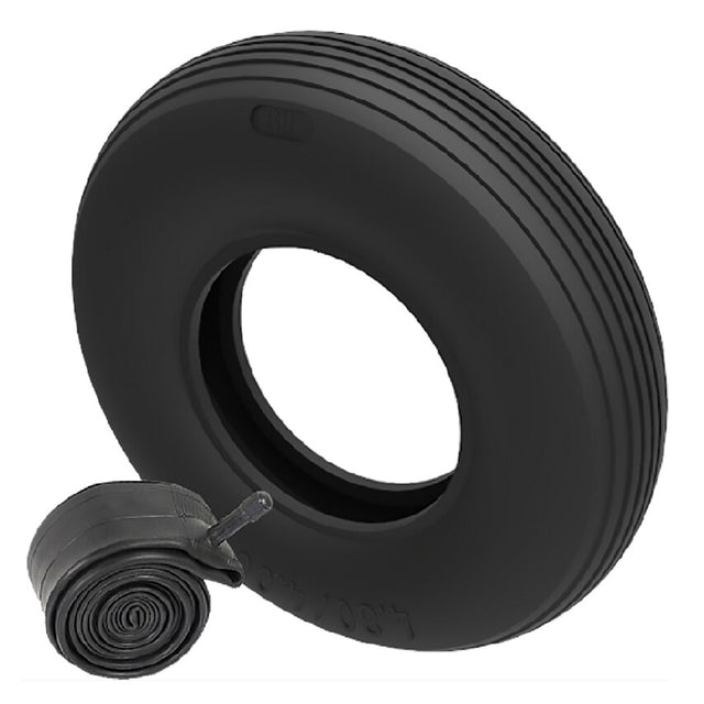 260mm x 85mm pneumatic tyre and inner tube with ribbed pattern and 4 ply rating 200kg load capacity. REACH Compliant.