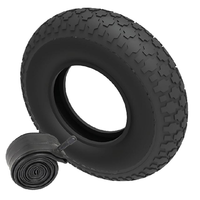 400mm x 100mm pneumatic tyre and inner tube with block pattern and 4 ply rating 200kg load capacity. Tread Width 100mm REACH Compliant.
