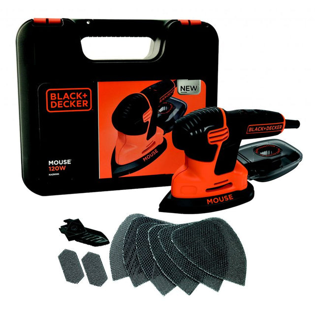 Black+Decker 120W Next Generation Mouse Sander With Kitbox and 9 Accessories Dust sealed slide switch for reduced fatigue during continual operation New compact design allows for optimum control, with three separate rubber gripping areas Micro filtration dust canister for optimum dust collection Detail base designed to give better results when sanding intricate areas Quick fit new and innovative mesh sanding sheets provide four times the life of standard sand paper