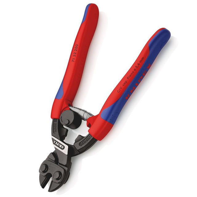 The Knipex CoBolt multiplies the hand force used to grip the handles 35 times over The Knipex 7132200SB (carded) CoBolt Compact Bolt Cutters, a small tool with big impact those used to working with standard bolt cutters will appreciate how user-friendly the CoBolt is. Thanks to their practical size of 200mm and low weight of less than 400g, the strong compact bolt cutters are quickly at hand and are also a powerful partner in demanding situations, such as when working above head height. Even the hardest wire is no problem, and they master piano wire up to a diameter of 3.6 mm reliably. When cutting bolts, nails and rivets up to a diameter of 6 mm (in the case of soft material), you benefit from maximum power and convenient handling. This high cutting performance is the result of long-standing engineering experience. The precision cutting edges made of chrome-vanadium high-performance steel are induction hardened and therefore guarantee the greatest cutting edge hardness. The particularly efficient lever-action mechanism guarantees an extremely favourable lever ratio with simultaneously low friction. The CoBolt multiplies the hand force used to grip the handles 35 times over. Features: With recess for easier cutting of thicker wires Cuts bolts, nails, rivets, etc. up to 5.2 mm dia. With precision cutting edges for soft, hard and piano wire Chrome vanadium heavy-duty steel, forged, multi stage oil-hardened Efficient joint design ensures exceptional cutting performance with little effort With gripping surface below the joint for gripping and pulling wires from 1.0 mm Cutting edges additionally induction-hardened, cutting edge hardness approx. 64 HRC The recess in the blade allows easier cutting of thicker wires, e. g. for anchor bolts in false ceilings Opening spring and locking device are integrated in the handles also for comfortable work and protected transport Specifications: Style: 3 Weight: 0.370kg Part number: 7132200SB Pliers: Black Atramentized Dimensions: 200 x 62 x 24mm Handles: with slim multi-component grips Cutting capacities soft wire (diameter): 6mm Cutting capacities hard wire (diameter): 4.0mm Cutting capacities piano wire (diameter): 3.6mm Cutting capacities medium hard wire (diameter): 5.2mm