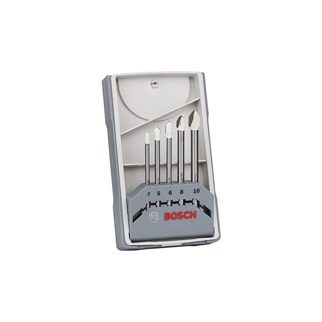 This Bosch drill bit set is designed for use with all soft to medium density tiles, porcelain, ceramics and non-toughened glass. It's part of the Bosch Pro Accessories range and comes packed in a plastic case. FEATURES - Straight shank glass and tile drill bits - Highly durable carbide with reinforced head that maximised lifetime of the bit - Centring tip for a precise drilling start - Suitable for all soft to medium density tiles, porcelain, ceramics and non-toughened glass - For use in low speeds and without impact - No cooling required CONTENTS - 1x 4mm Ceramic Tile Drill Bit - 1x 5mm Ceramic Tile Drill Bit - 1x 6mm Ceramic Tile Drill Bit - 1x 8mm Ceramic Tile Drill Bit - 1x 10mm Ceramic Tile Drill Bit - 1x Case