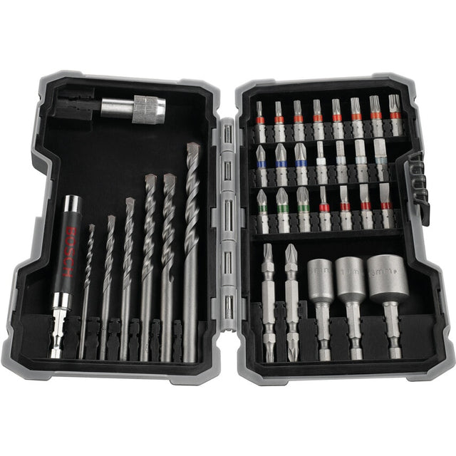 This handy set comes in a hard plastic case. Quality CYL-3 Concrete Drill Bits. Impact-resistant hammer drill bits with guaranteed longer life in concrete, extremely bend-resistant. With a unique designed deep U-shaped flute which effectively prevents clogging caused by drilling dust. Wide and deeply supported tungsten carbide plate prevents the tip from breaking out. 35-piece drill and screwdriver bit set with quick-change universal holder as well as magnetic universal holder.