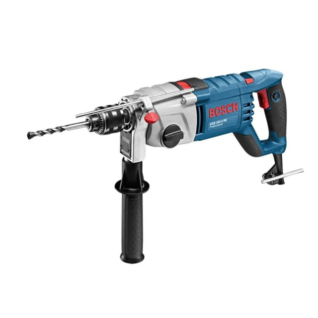 Bosch GSB 162-2 RE Professional Impact Drill for drilling in masonry, stone, wood, and metal. Its extremely strong 1,500W motor with a high overload capacity and high torque is ideal for intense and heavy-duty applications. The speed has been specifically optimised to enable a fast drilling progress up to 162mm in diameter even when using diamond core cutters in the non-impact function. The impact drills rotation control clutch ensures an increased level of user protection even when working in the toughest materials. Supplied with: 1 x Keyless Chuck 16mm, 1 x Auxiliary Handle, 1 x Depth Stop 210mm and 1 x Carry Case. Specifications: Bit Holder: 5/8in-16 UNF.Input Power: 1,500W.No Load Speed: 0-750/1,800/min.Impact Rate: 0-12,750/30,600/bpm.Max. Torque: 17Nm.Weight: 4.8kg.