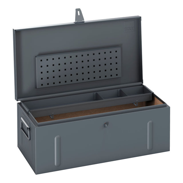 Steel tool chest U830 Manufactured in heavy duty, phosphated steel withpadlockable hasp and staple clasps, wrap over shower resistant lid, removable parts tray, double grip handles and hardboard lining. weight20.2kg. Internal WxDxH: 790x395x295mm. Finished in durable powder coatpaint in RAL 7016 anthracite grey. WxDxH: 830x440x340mm.