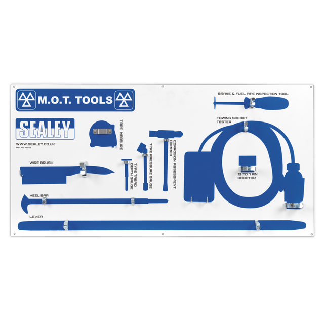 Shadow board for MOT approved and compliant tools (tools not included). Keeps tools organized and in one location. Wall mounting and supplied with fitting kit.
