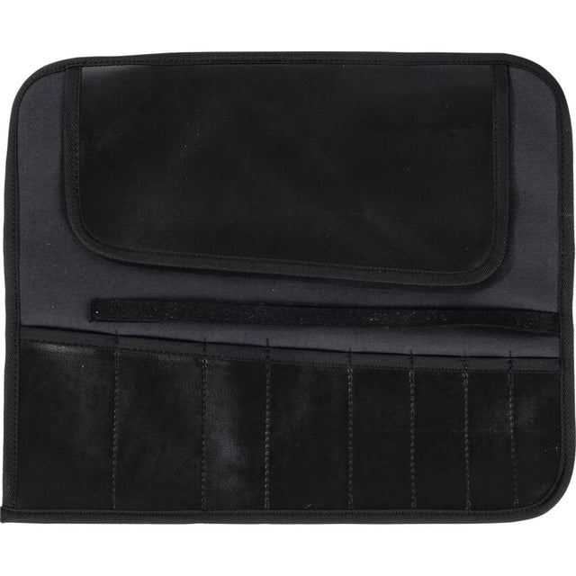 Waterproof chisel roll with 8 flat pockets. PVC coated cotton, with securing leather strap and metal buckle fastening. Tools secured with flap cover. Dimensions (approx): (H)370mm x (L)490mm.