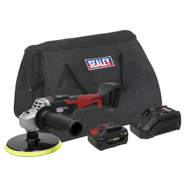 Digital display and variable speed control from 500-3000rpm.Features a slide-button on/off switch allowing for a smooth comfortable main handle grip.Spindle lock for fast and easy pad changes.Double injection composite housing with rubber grip for added comfort.Supplied with 150mm backing pad and side handle.Supplied with mains charger, two 4Ah batteries and a canvas storage bag.Package includes:Model No. - DescriptionCP20VRP - Cordless Rotary Polisher 150mm 20V Lithium-ion - Body OnlyCP20VBP4 - Power Tool Battery 20V 4Ah Lithium-ion for CP20V Series (x2)CP20VMC - Battery Charger 20V Lithium-ion for SV20 SeriesCP1200CB - Canvas Tool Storage BagBare unit covered by our 3 year guarantee* - batteries, charger and carry bag covered by our standard 1 year guarantee.You may also refer to the individual Model No. for full specification.